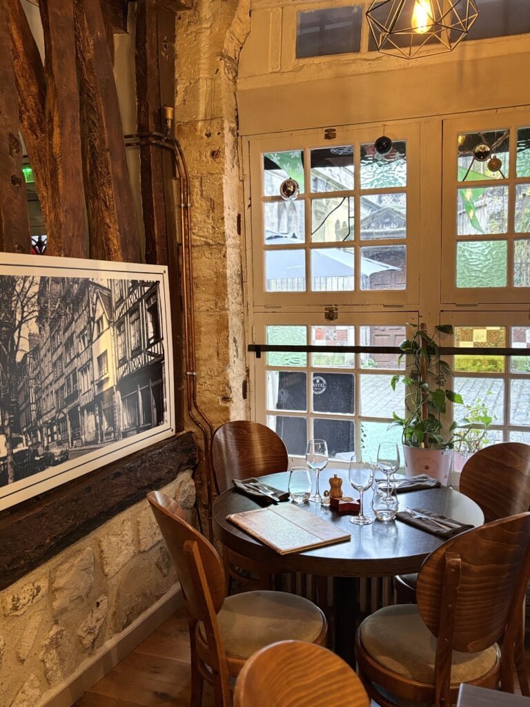 L’Auberge Saint-Maclou fait partie de ces adresses rouennaises que l’on découvre ou redécouvre avec plaisir, installée dans le cadre vivant du quartier des Antiquaires. Dès l’arrivée, l’accueil est simple et chaleureux, porté par une équipe attentive qui met immédiatement à l’aise. La cuisine s’appuie sur le répertoire traditionnel local, avec des produits normands issus de producteurs en direct, tout en apportant une touche actuelle qui modernise les plats sans les dénaturer. À table, les assiettes sont généreuses et gourmandes, entre terrine maison, poissons de la région, viandes normandes et desserts faits maison. La carte évolue au fil des saisons, complétée par une ardoise hebdomadaire proposant toujours une option végétarienne, et une sélection de vins pensée pour accompagner le repas. Une table conviviale et réconfortante, où l’on vient avant tout pour bien manger et passer un bon moment.