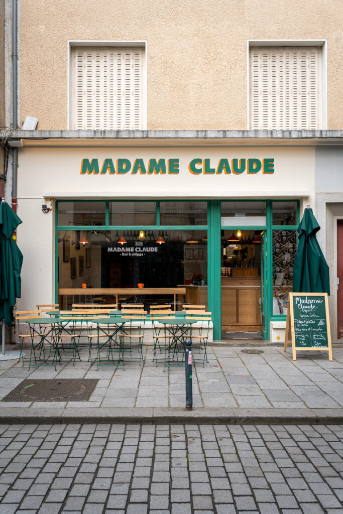 Madame Claude à Rennes est un bar à food bretonne installé au 23 rue de Penhoët, au cœur du centre historique. Dans cette ancienne laverie rénovée, l’ambiance joue sur des notes pop et chaleureuses avec une déco lumineuse où l’on savoure galettes et crêpes préparées avec des produits locaux (farines de Bretagne, cidre bio, œufs et laits de fermes voisines). La formule originale de l’adresse repose sur une approche “street food” : les galettes salées et crêpes sucrées peuvent être dégustées sur place ou à emporter dans un cornet recyclable, ce qui rend l’expérience à la fois simple et conviviale. On y trouve des classiques bien exécutés comme des compositions plus créatives, le tout dans une atmosphère détendue qui convient aussi bien pour une pause rapide qu’un moment gourmand entre amis.