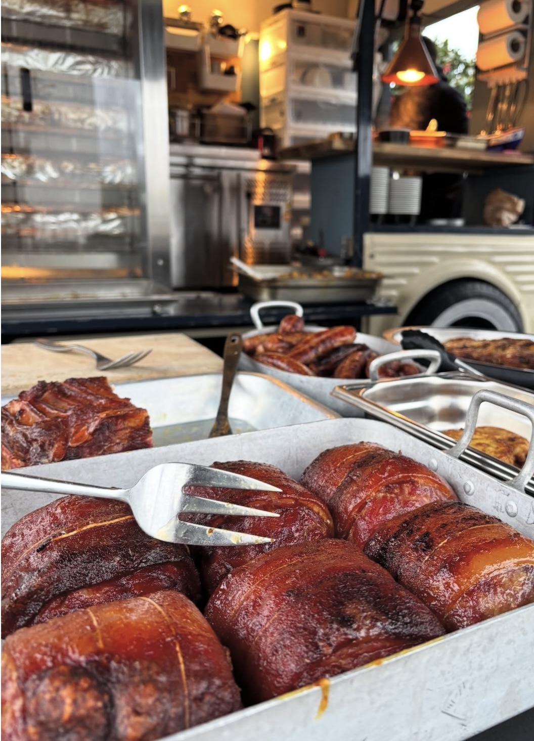 Découverte aux abords de Bénodet, la rôtisserie ambulante West est portée par Didier et Gwen, qui accueillent avec simplicité et bonne humeur. Aux fourneaux, Didier prépare un poulet rôti Label Rouge, des saucisses, du jambonneau ou encore du lard, tous issus de la région, accompagnés de légumes, de pommes de terre grenailles ou d’un gratin dauphinois en clin d’œil à ses origines. Le West propose aussi un lobster roll au homard des Les Glénan, pêché chaque matin, une alternative marine qui complète joliment l’offre.